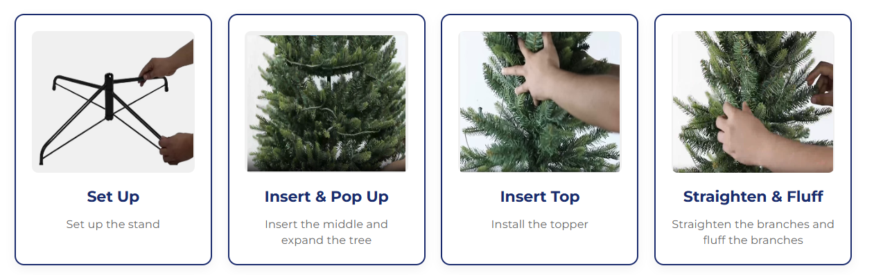 The setup experience is intentionally simple. First, the user opens and positions the black metal stand. Next, the center pole is inserted and the tree rises into place through a pull up mechanism. The top piece is then added and the branches are adjusted for final shaping. The tree also collapses with ease and stores flat in a compact container that is suitable for small spaces.